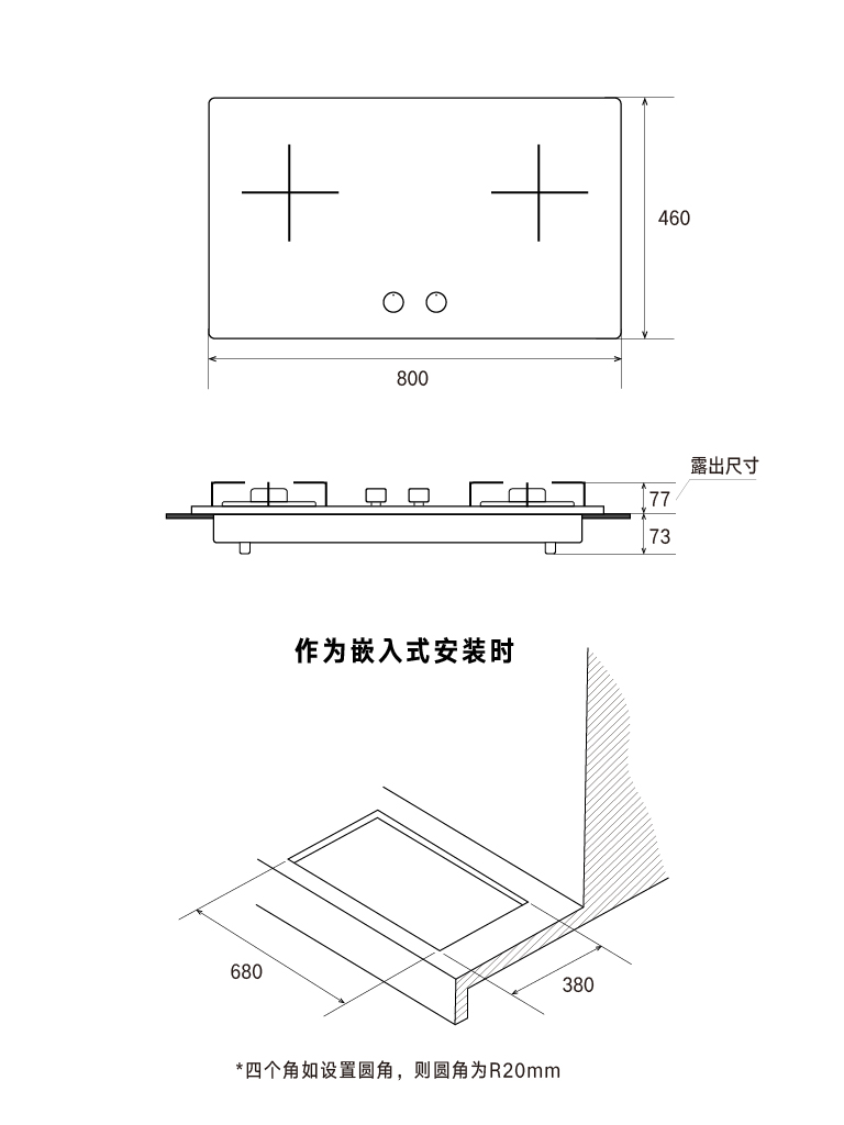 嵌裝開(kāi)孔尺寸(mm) : (K6)(W)680×(D)380×R20